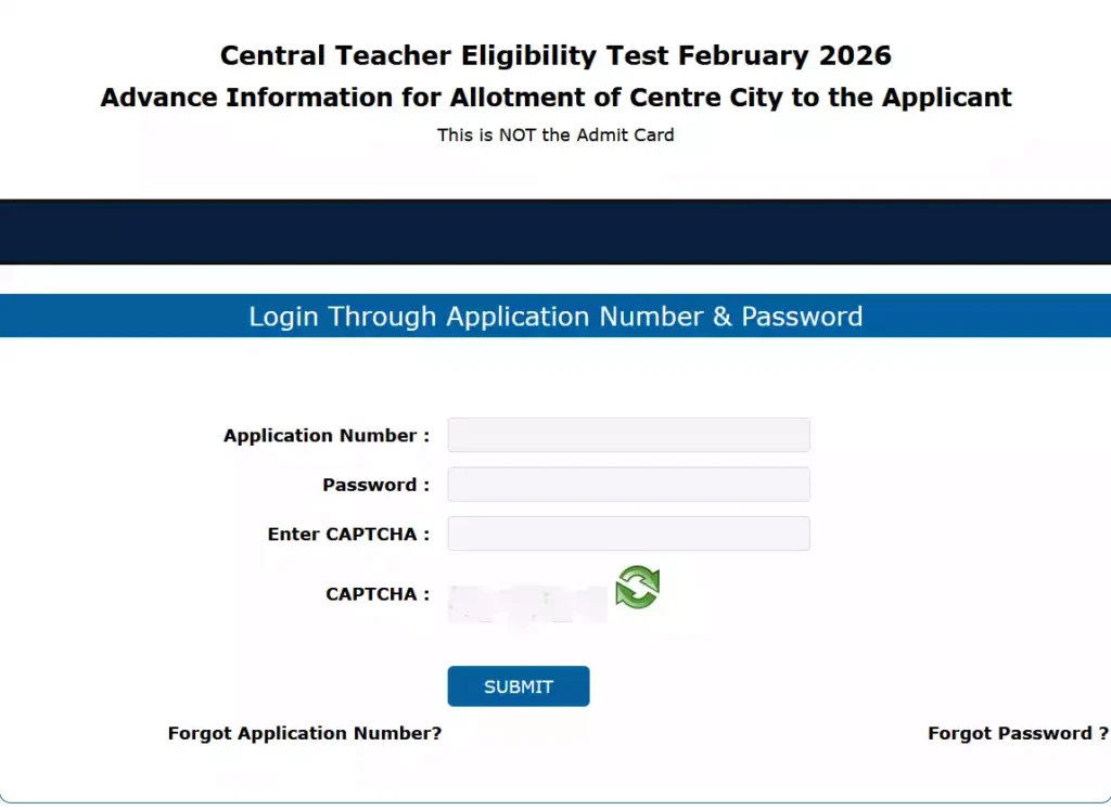 सिटी इंटिमेशन स्लिप: जारी हो चुकी है, उम्मीदवार अपने एप्लिकेशन नंबर और पासवर्ड डालकर ctet.nic.in पर देख सकते हैं। Direct link